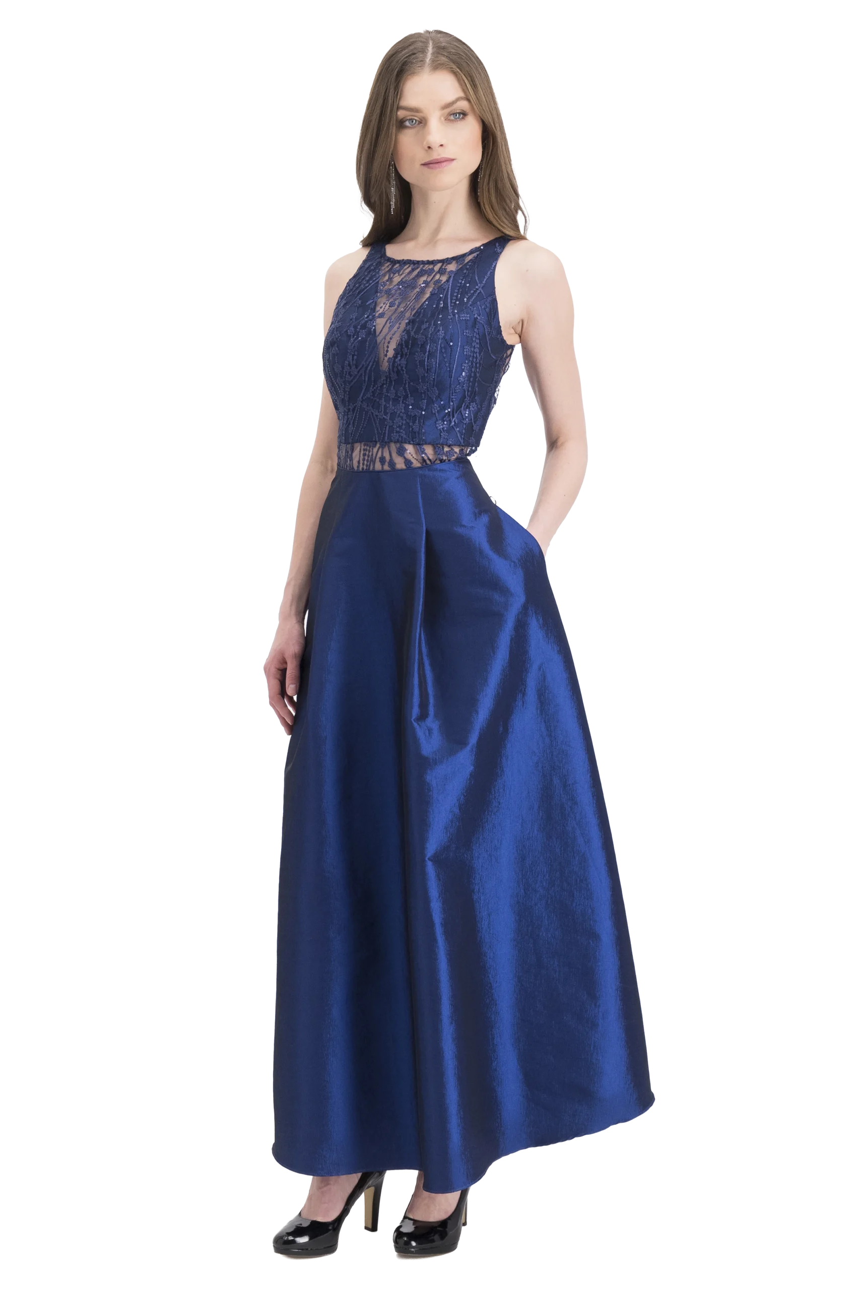 Vestido largo, escote en “V” con transparencia, falda “A” con pliegues y bolsillos, espalda semidescubierta y con transparencia hasta cintura.