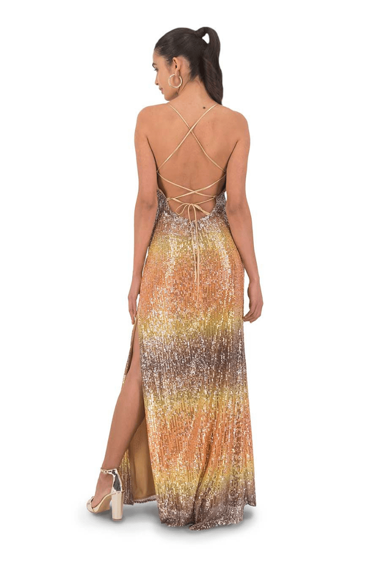 Vestido largo en lentejuela degradado. Escote columpio con abertura en falda a un costado. Espalda con escote profundo y jareta.