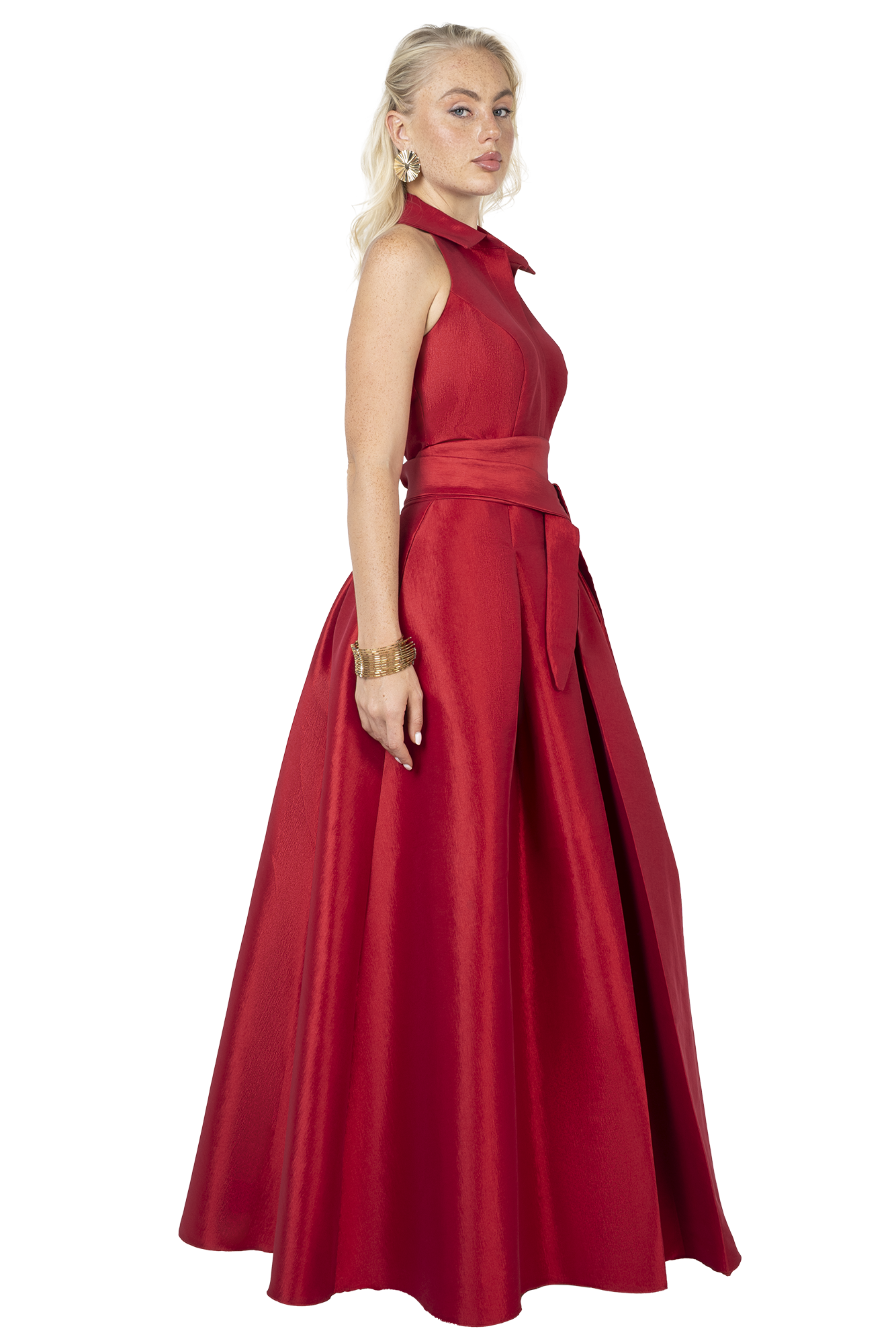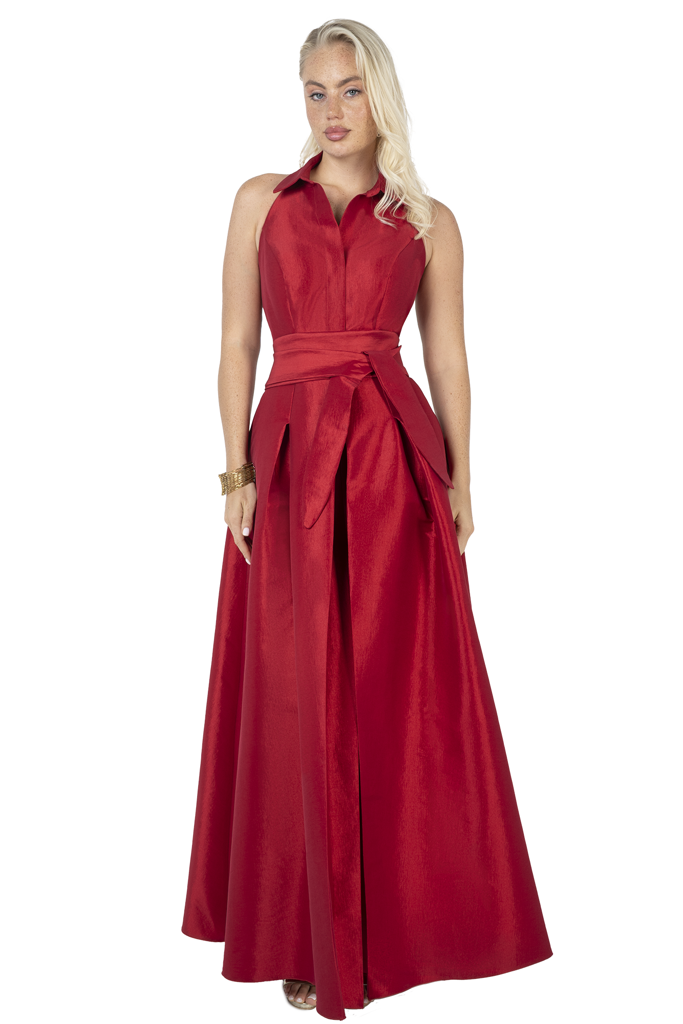 Vestido largo tipo halter con cuello italiano, fajilla en cintura formando moño. Falda línea A con tablas.