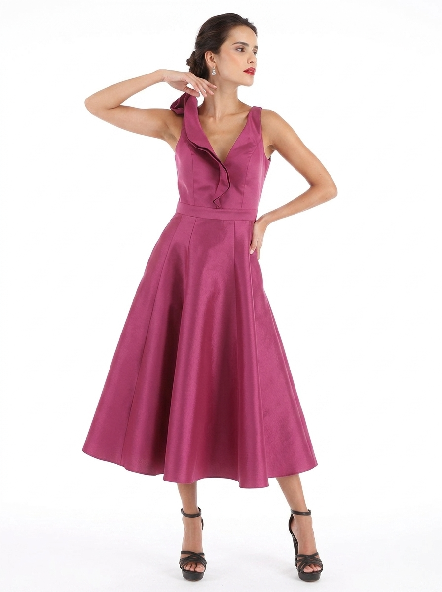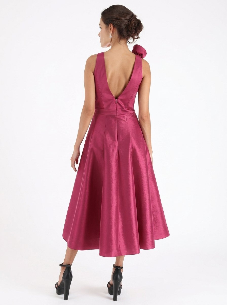 Vestido midi/corto escote V con flor de bies en talle, falda de gajos en medio circular con cortes al frente y espalda. Bolsillos laterales.