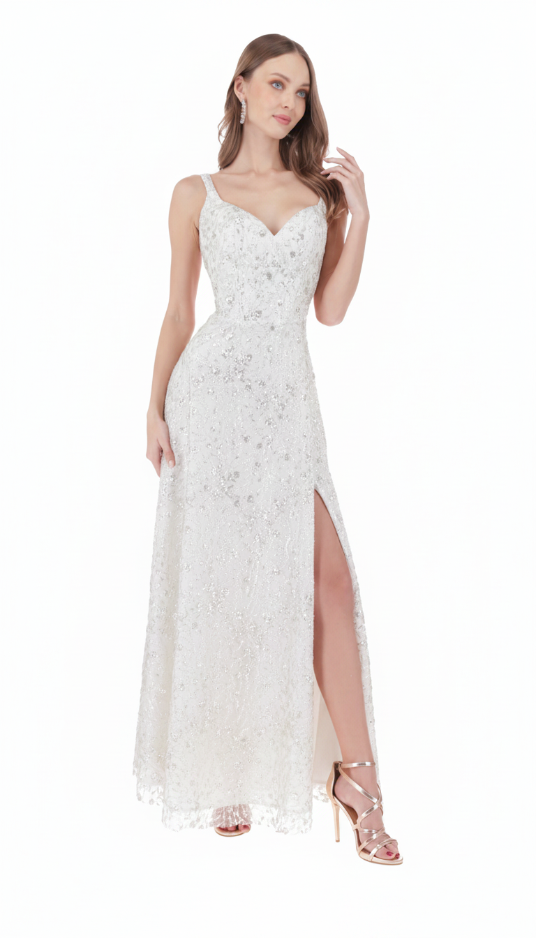 Vestido largo escote corazón con tirantes falda larga corte semicircular.