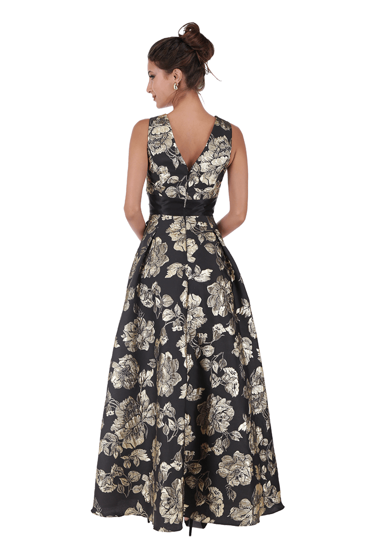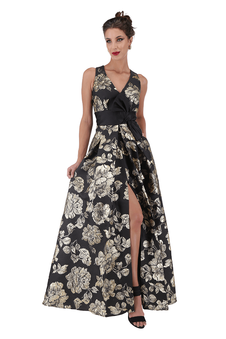 Vestido escote V con moño en cintura. Falda larga línea A con tablas.
