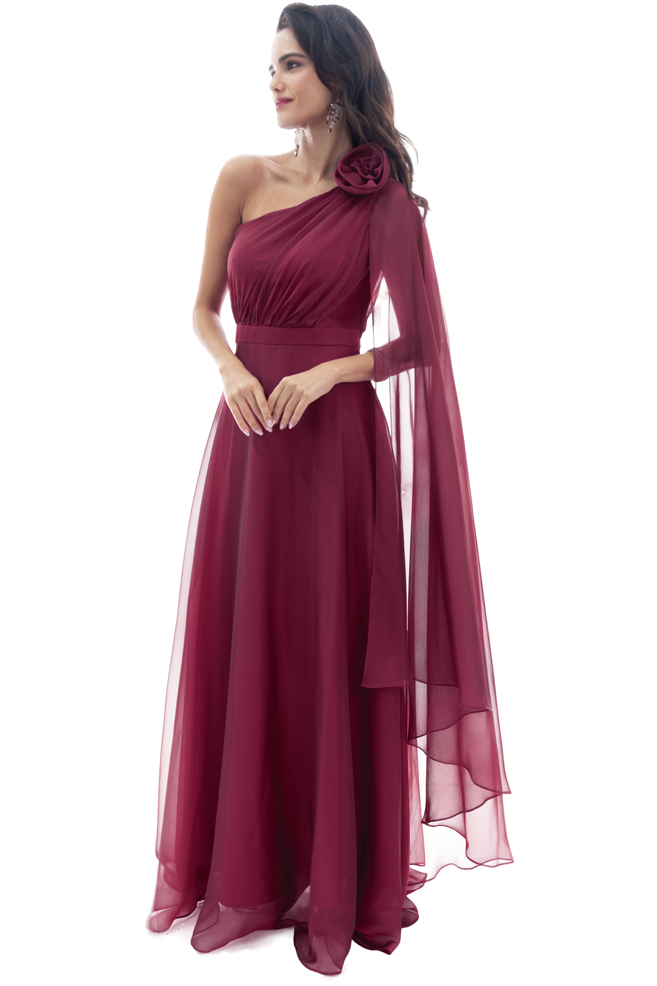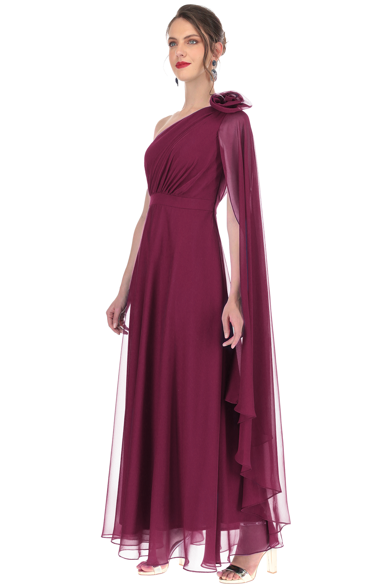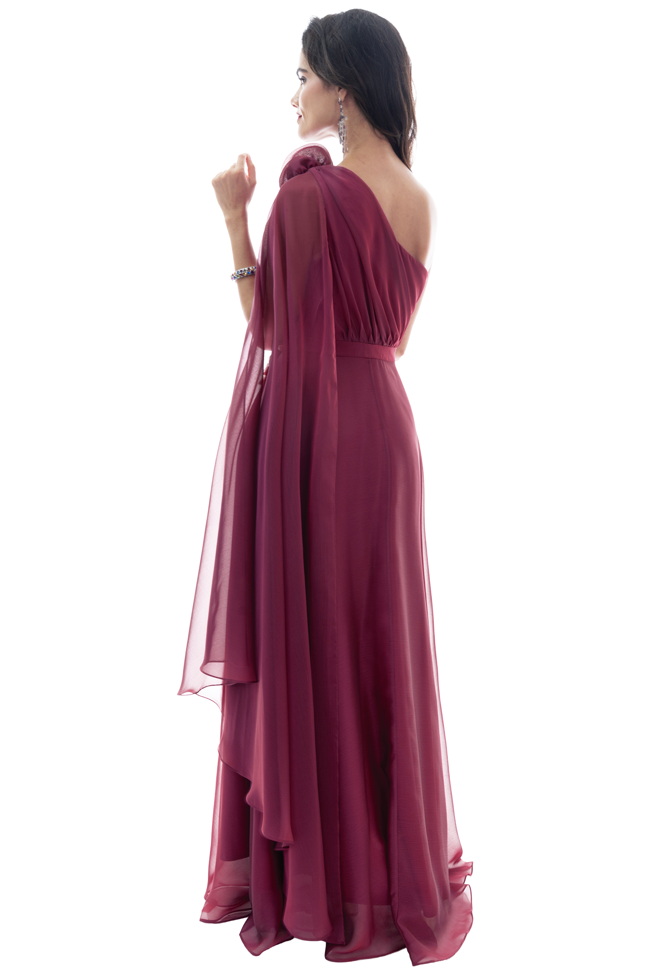 Talle: El diseño a un hombro ofrece una silueta asimétrica que alarga el torso. El talle drapeado de fajilla actúa como un elemento estilizador que define la cintura con precisión, creando una transición suave hacia la falda.