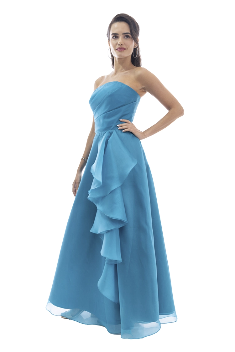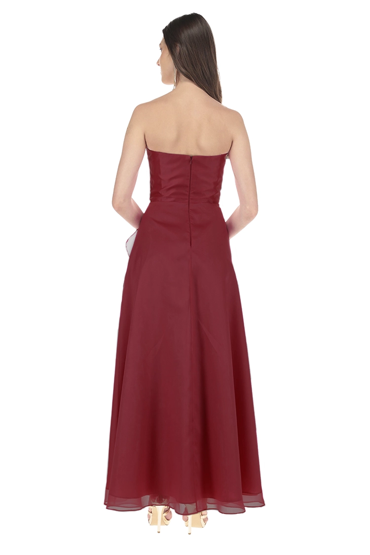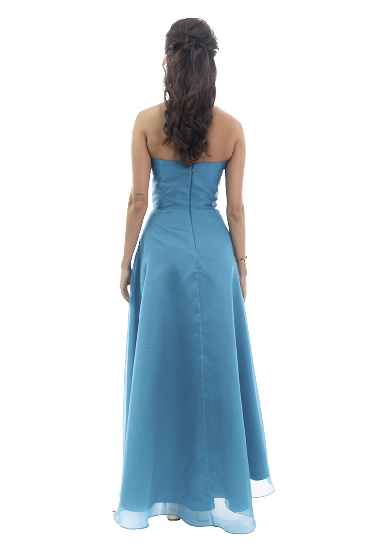 Vestido largo strapless drapeado de falda media circular con escarolas y abertura.