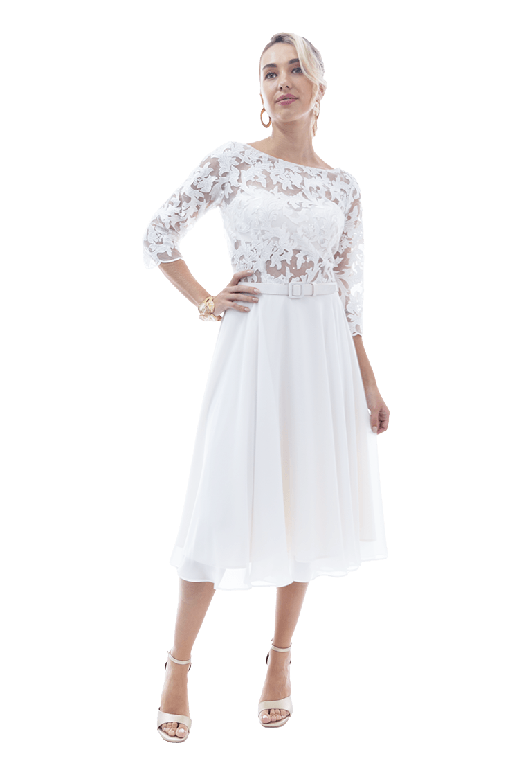 Vestido corto de cuello redondo alto y escote en espalda con manga larga y falda semicircular.