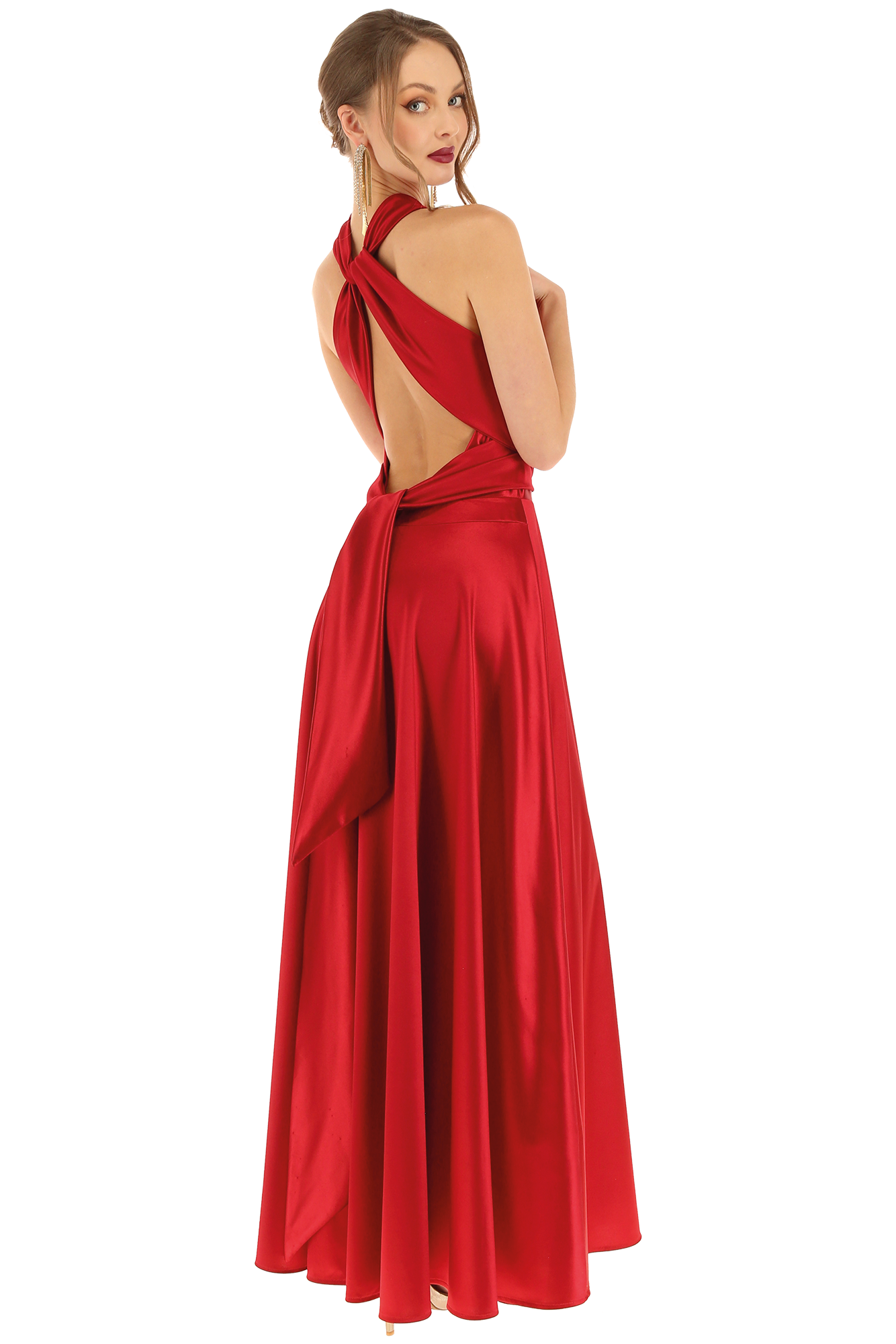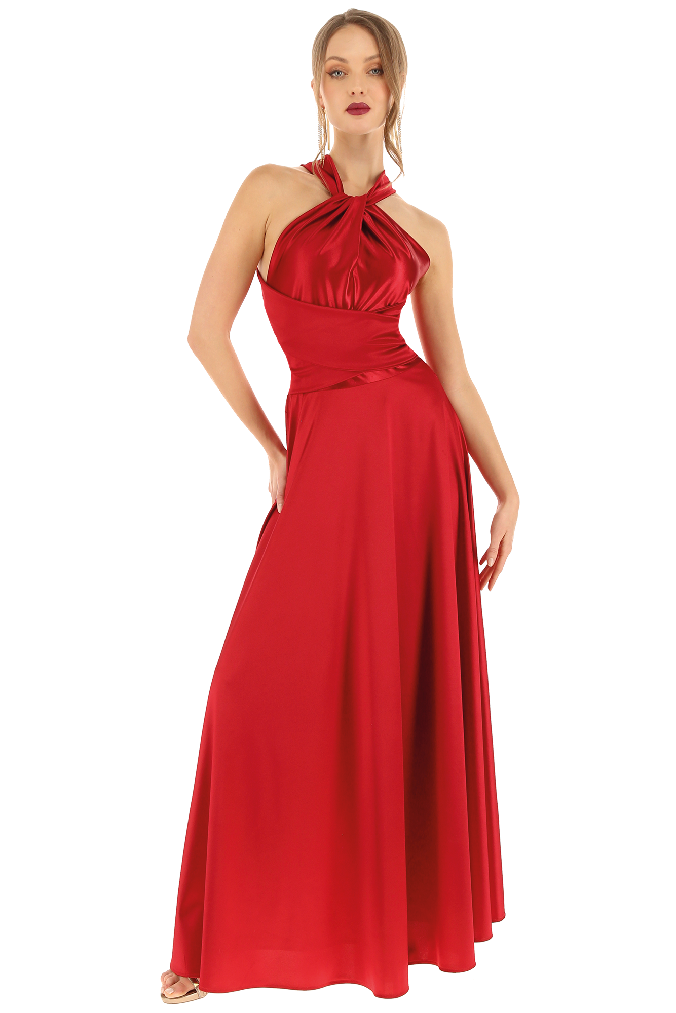 Este vestido largo color rojo es una pieza de alto impacto diseñada para resaltar la sensualidad con elegancia. El protagonista es su cuello halter con detalle anudado que estiliza el torso, complementado por una falda fluida que aporta un aire etéreo y sofisticado. Es la elección definitiva para eventos de noche donde el objetivo es lucir radiante, segura y absolutamente sexy.