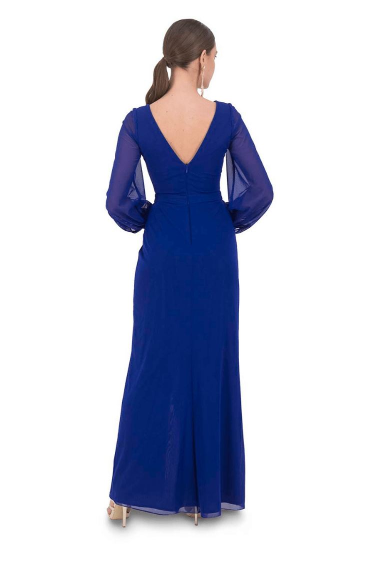 Este vestido largo en color azul rey es la pieza clave para eventos de gala o jardín que requieren un código de vestimenta sofisticado. Su diseño destaca por un equilibrio perfecto entre estructura y fluidez, utilizando mangas con volumen y un drapeado envolvente que favorece a todo tipo de cuerpo. Es una prenda que proyecta una imagen pulida, moderna y profundamente femenina.