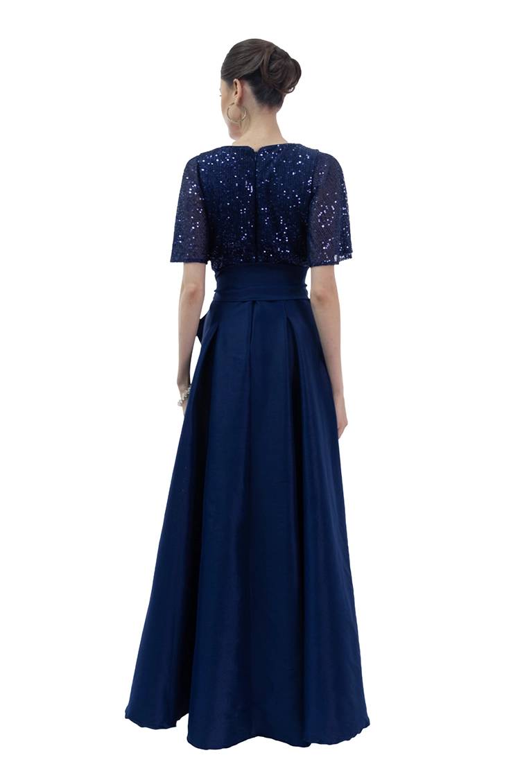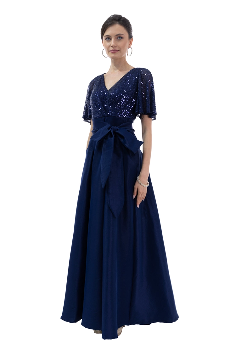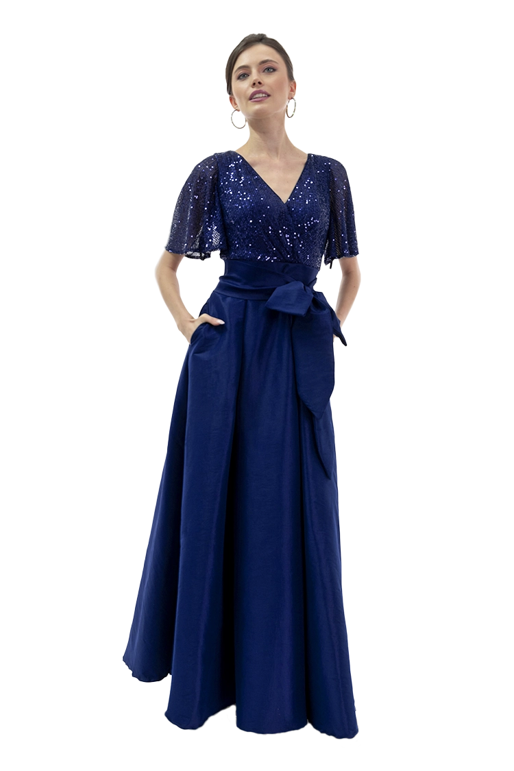 Vestido largo escote en V semi cruzado con manga campana, falda A con tablones y lazo a la cintura.
