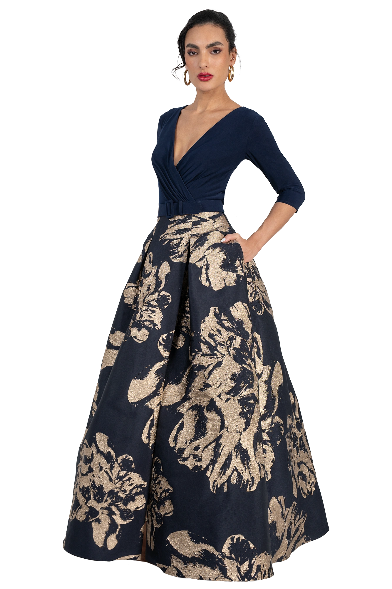 • Talle Flex con Ajuste de Guante: El cuerpo del vestido está confeccionado en Licra Ity Way, una tela premium que se amolda a tu busto y cintura con suavidad. El escote en “V” cruzado con pliegues y la espalda cerrada ofrecen un soporte excepcional, mientras que el cinturón forrado define tu silueta de forma armoniosa y elegante.