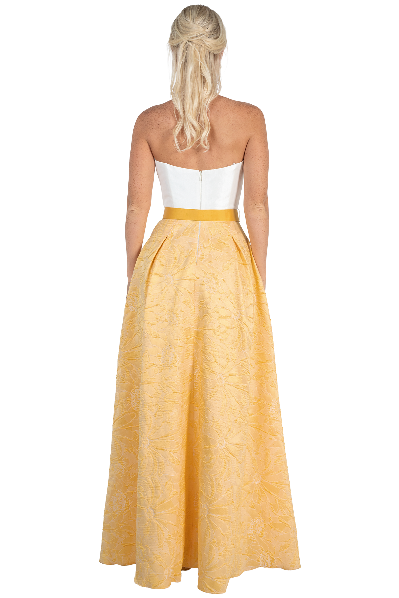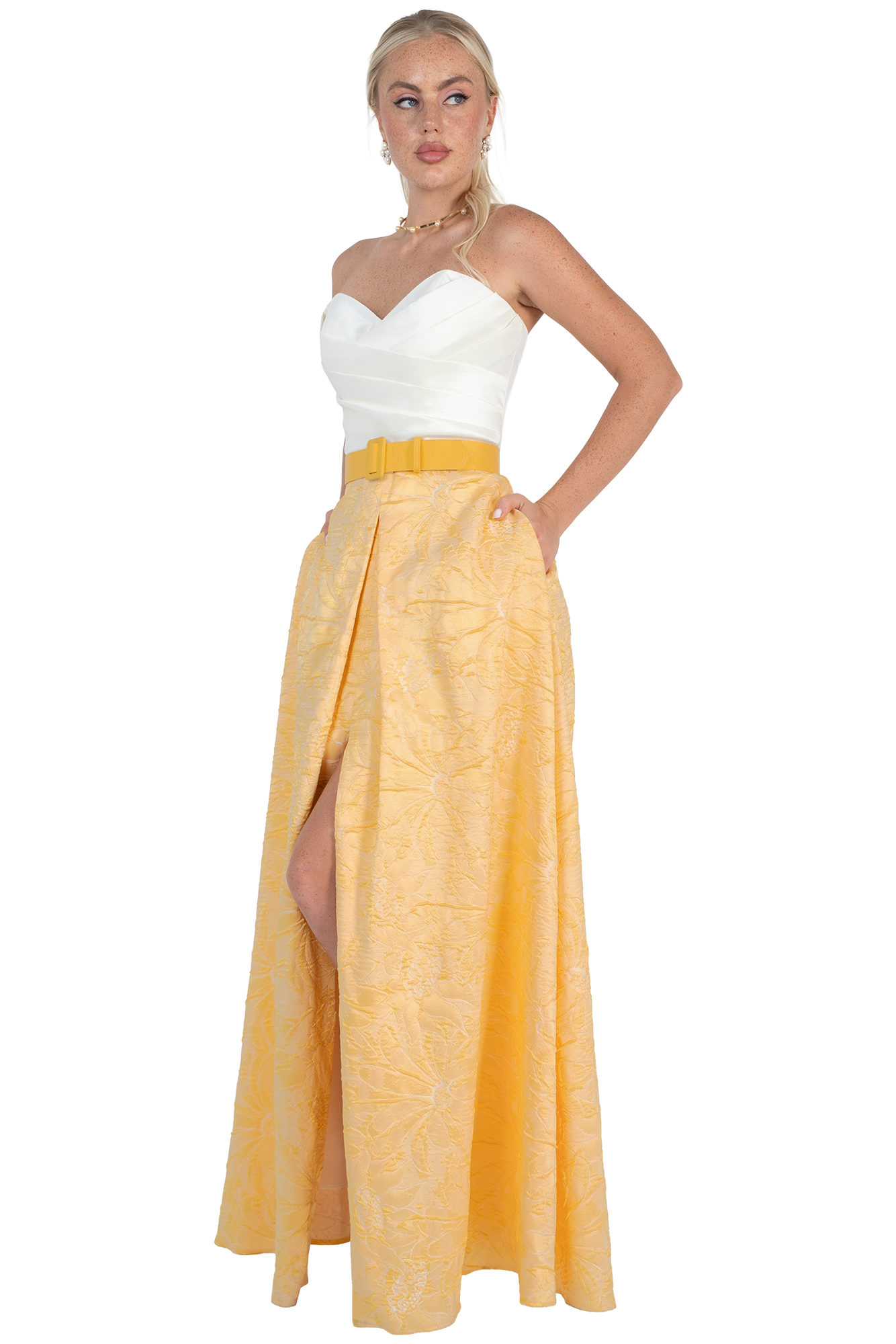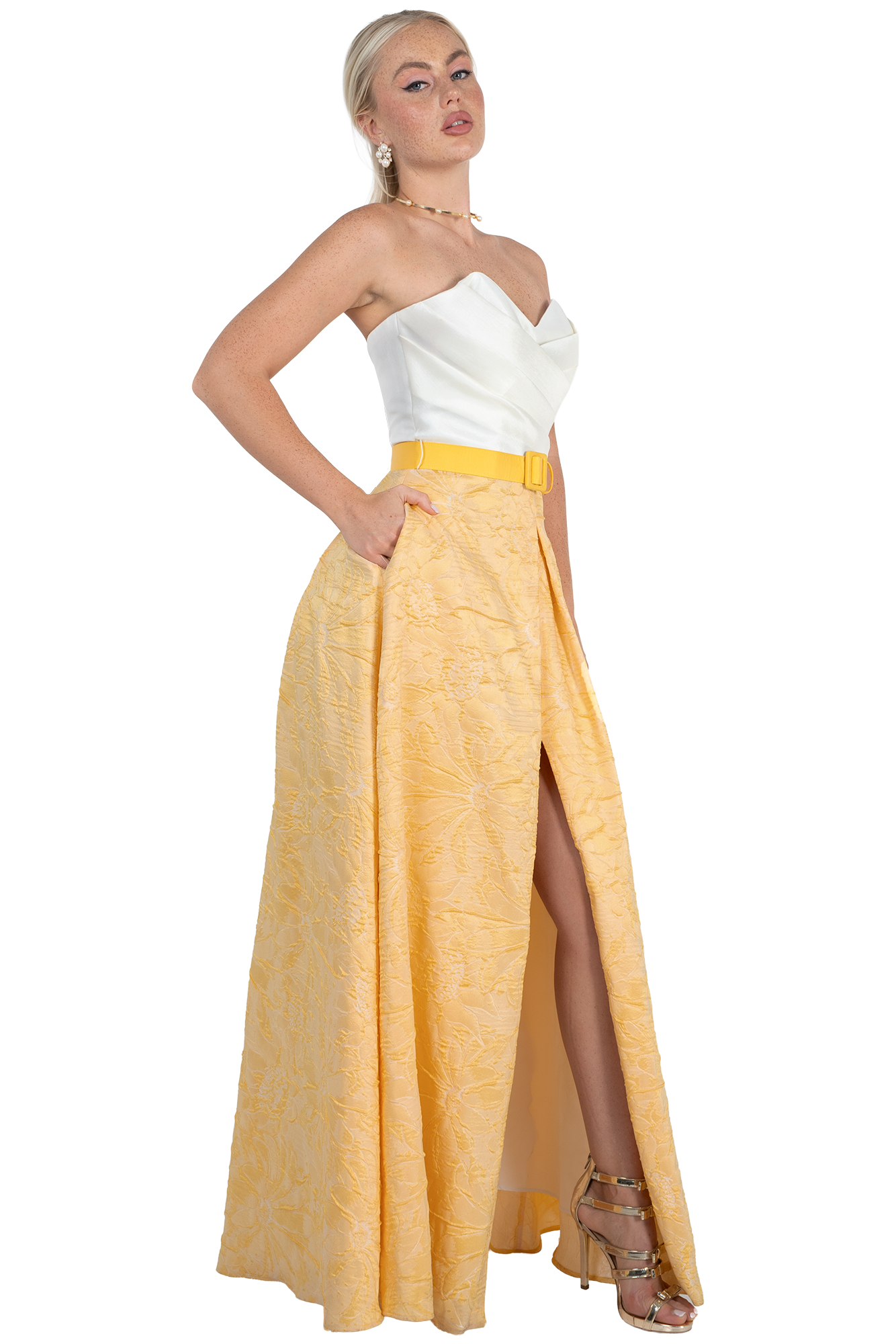 Como madrina, tu presencia es un pilar en la ceremonia, y este modelo de Massima 9520 está diseñado para que luzcas majestuosa. En un vibrante y sofisticado tono amarillo, este vestido largo es la definición de los vestidos elegantes de fiesta que logran capturar la luz y las miradas. Su diseño strapless y su falda arquitectónica proyectan una imagen de seguridad y frescura, ideal para bodas de día o grandes galas de noche.