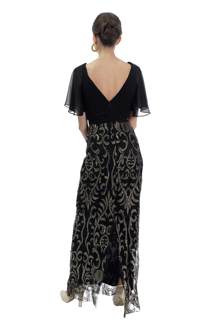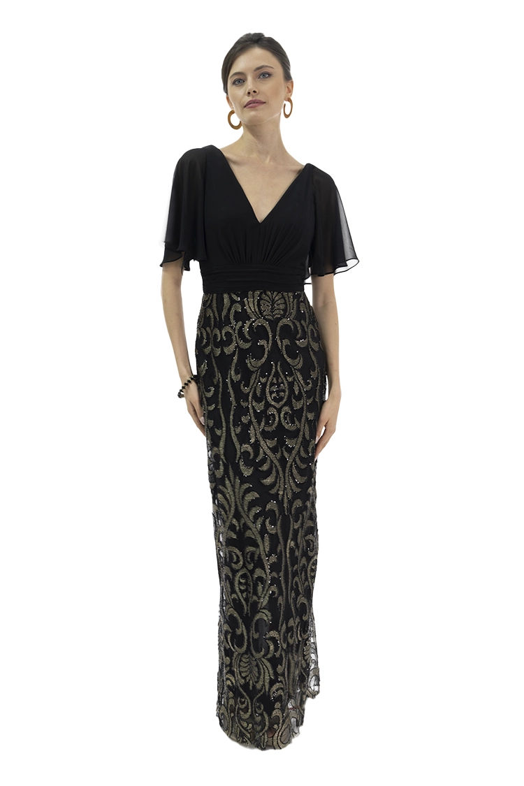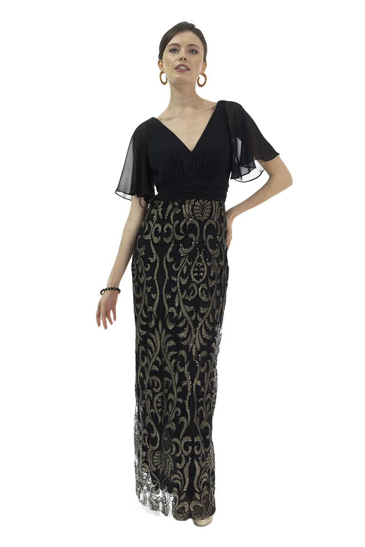 Vestido largo, escote en V con mangas de mariposa