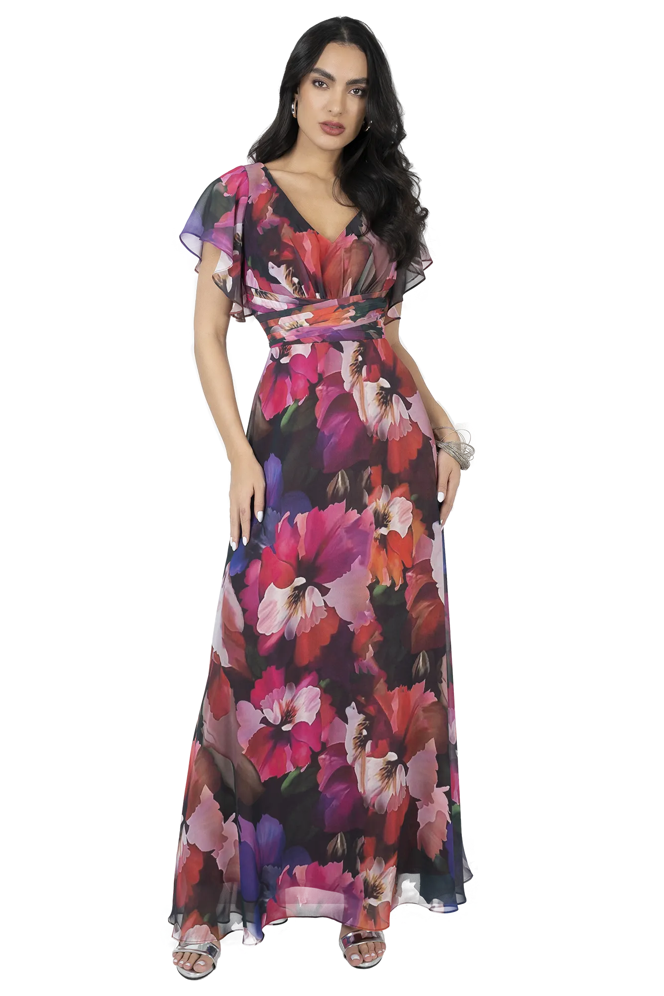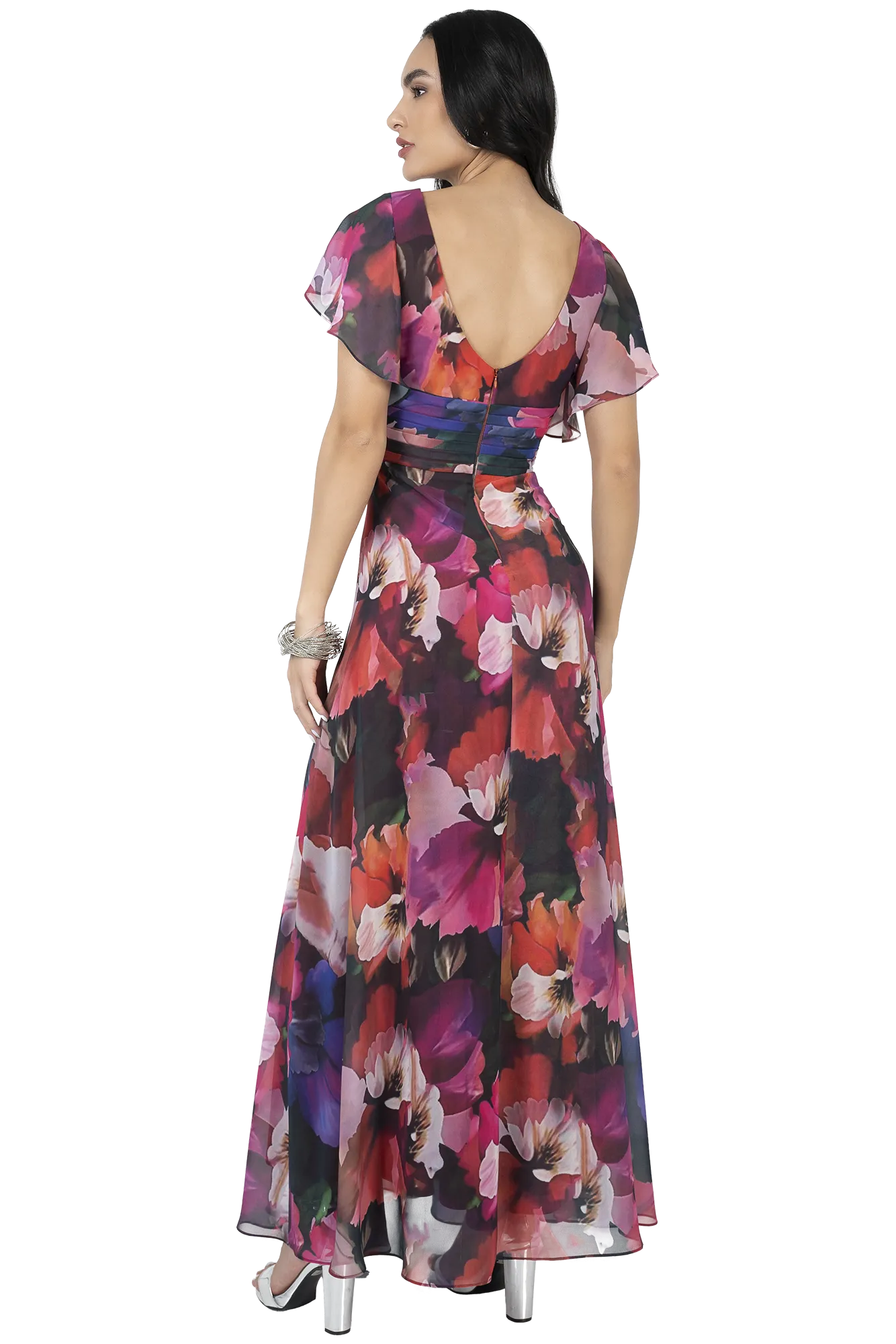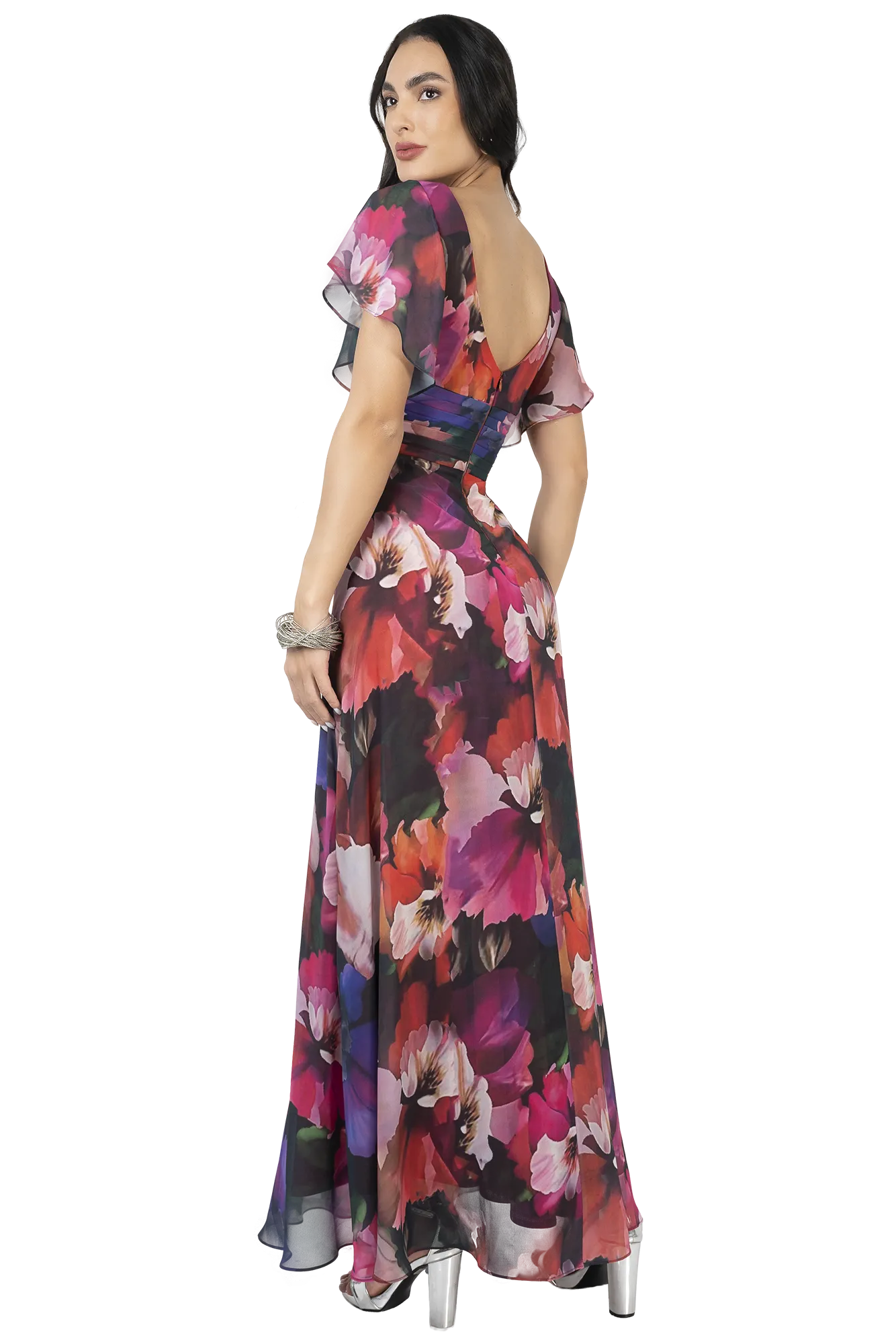 Vestido largo escote “V” con pliegue al centro fajilla con tablitas, falda circular espalda en “V” manga estilo campana