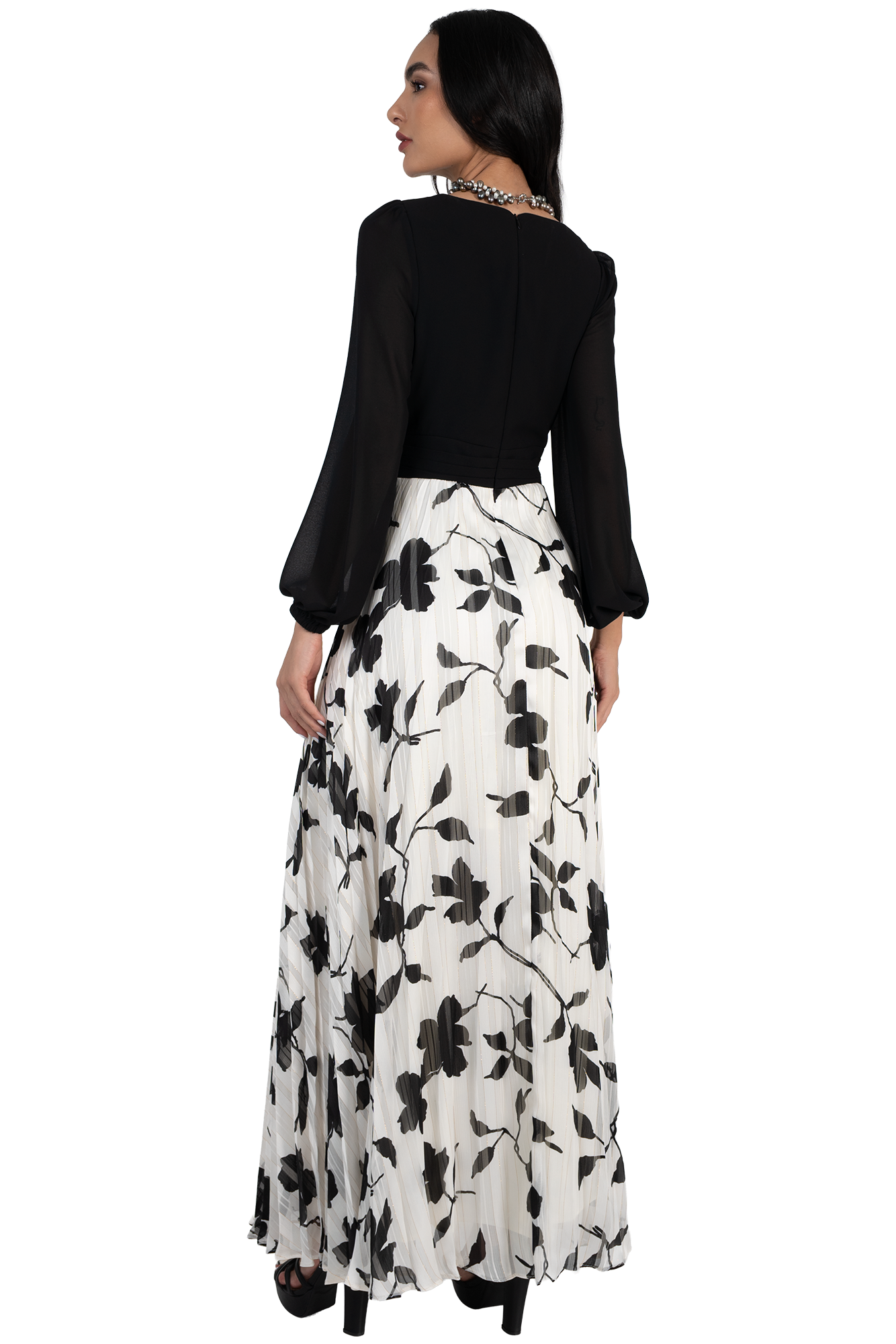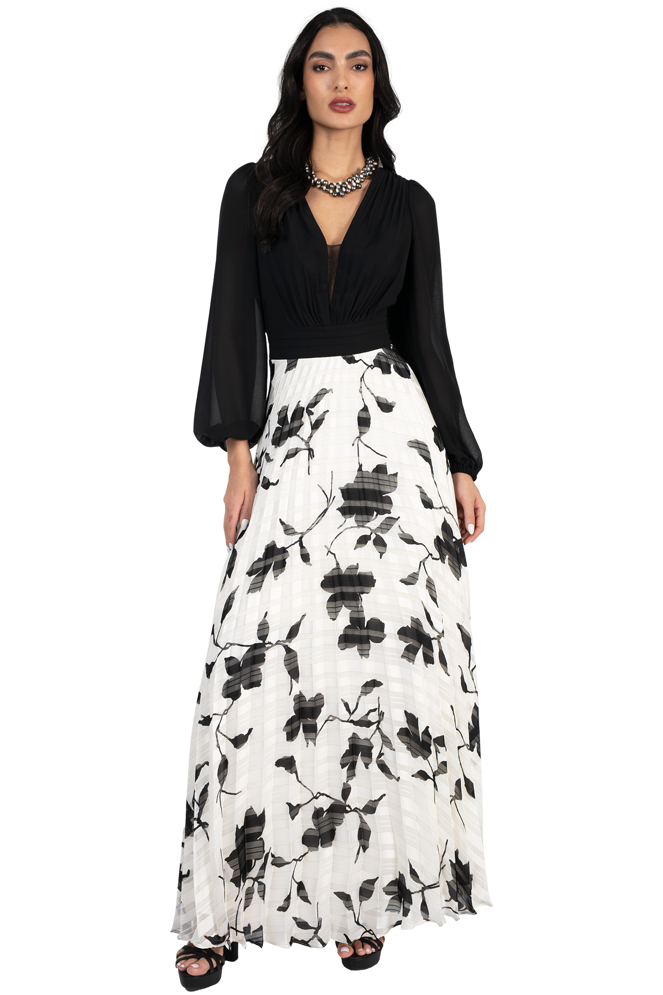 Mientras el Chiffon Estampado en blanco y negro aporta una profundidad visual única, el talle se siente como una caricia gracias a la suavidad del Chiffon Wash, presentando un drapeado artesanal que converge en una fajilla con tablitas diseñada para definir tu cintura con precisión.