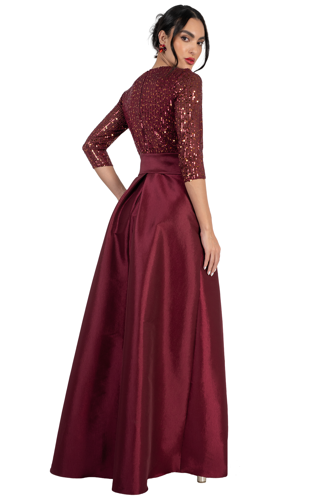 Vestido de Gala Largo Color Vino con Lentejuela y Manga 3/4
