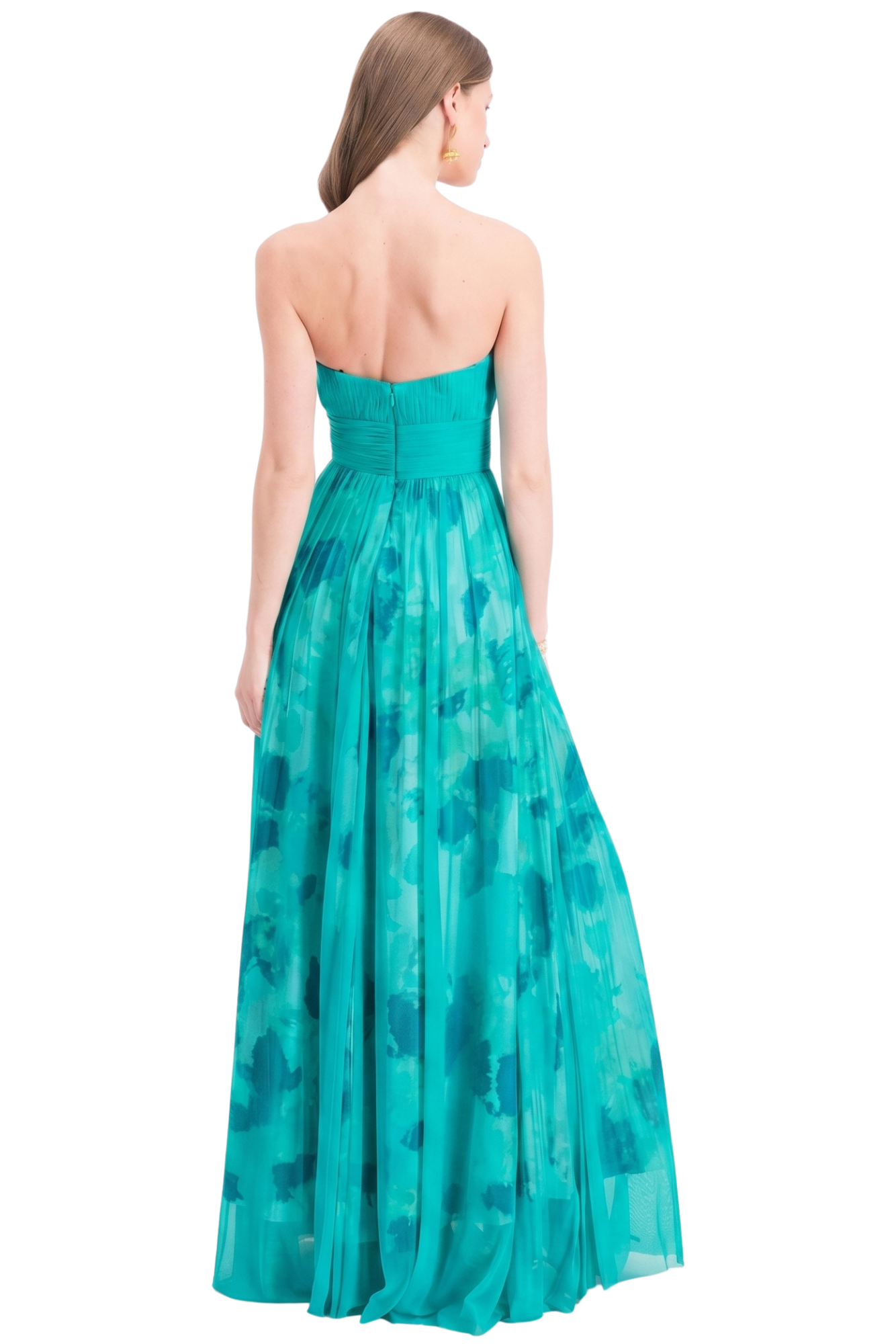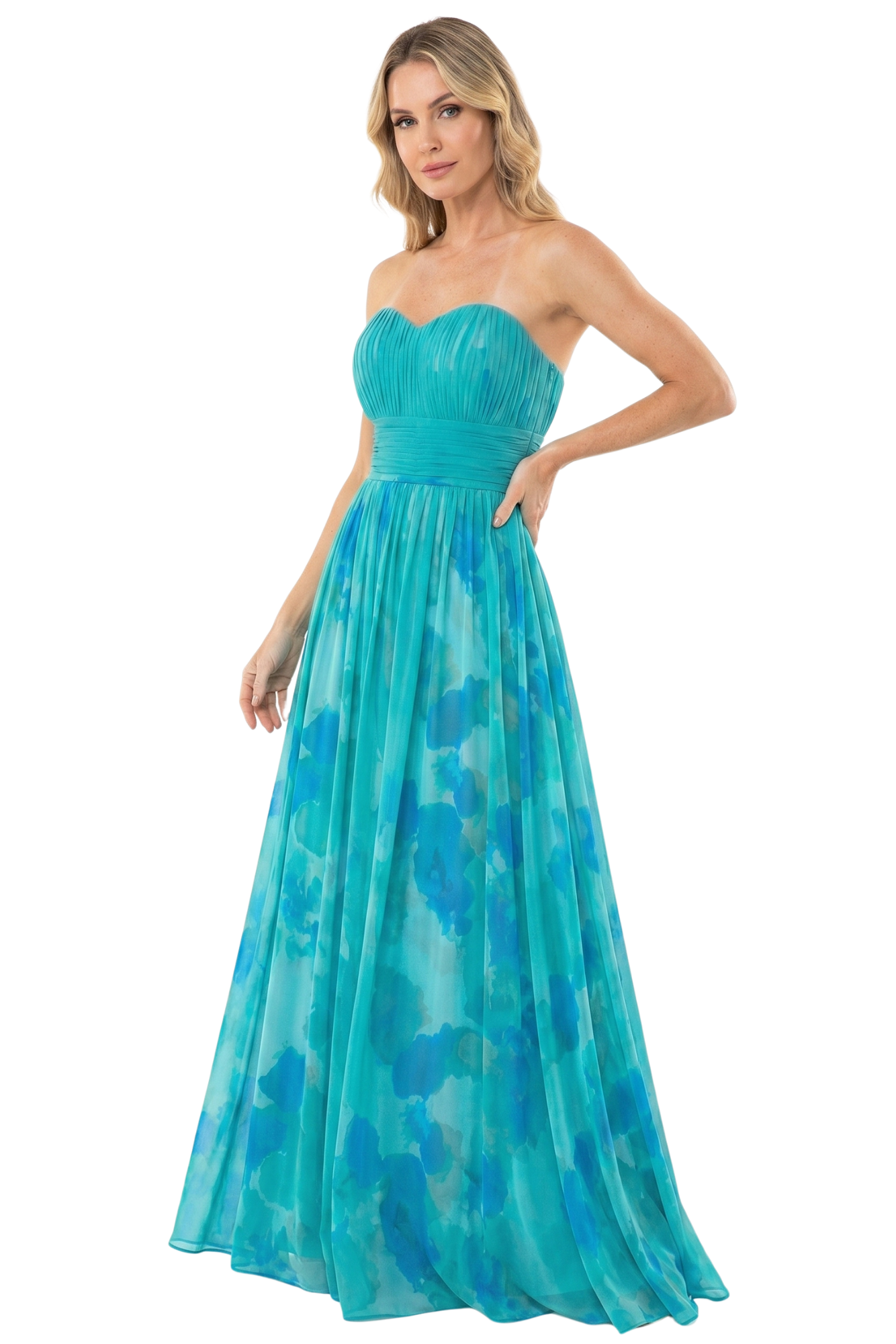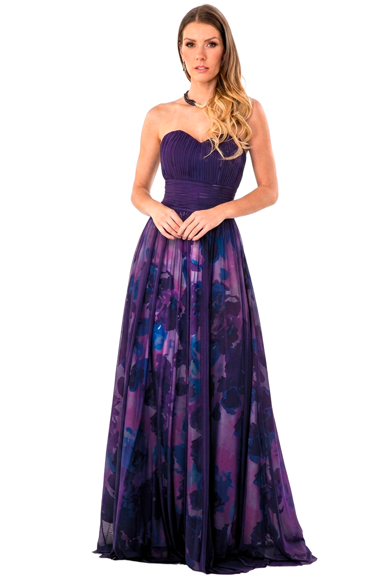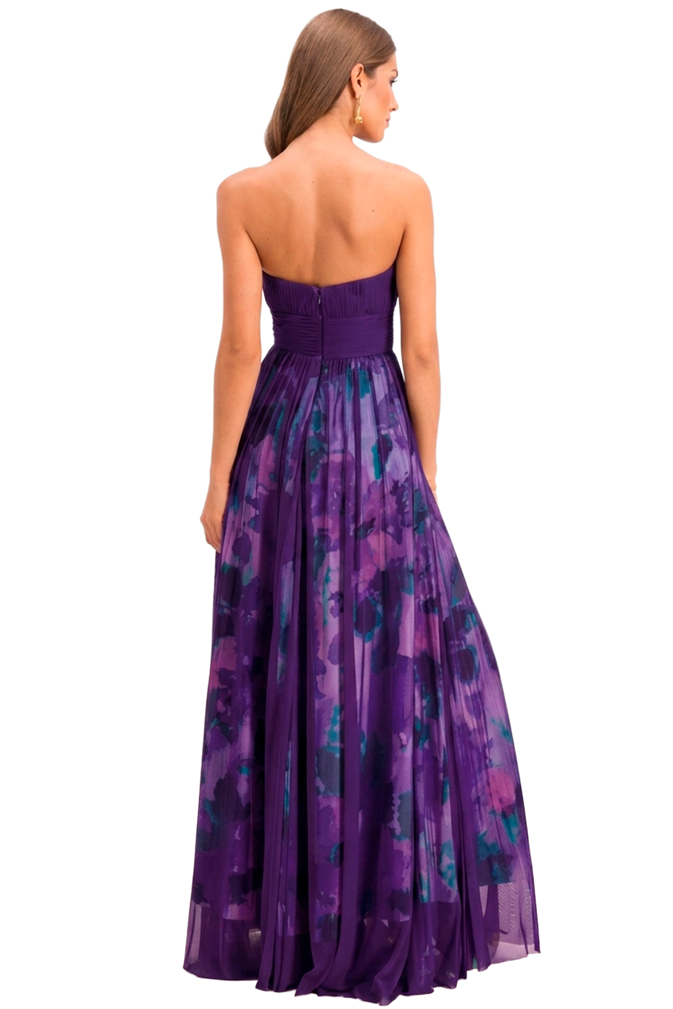 Deslumbra con este espectacular vestido largo de fiesta, ideal para invitadas que buscan un look romántico y sofisticado. Su diseño strapless destaca por un talle artesanalmente drapeado que define la silueta, mientras que su falda amplia con estampado floral en tonos morados aporta un aire etéreo y majestuoso.