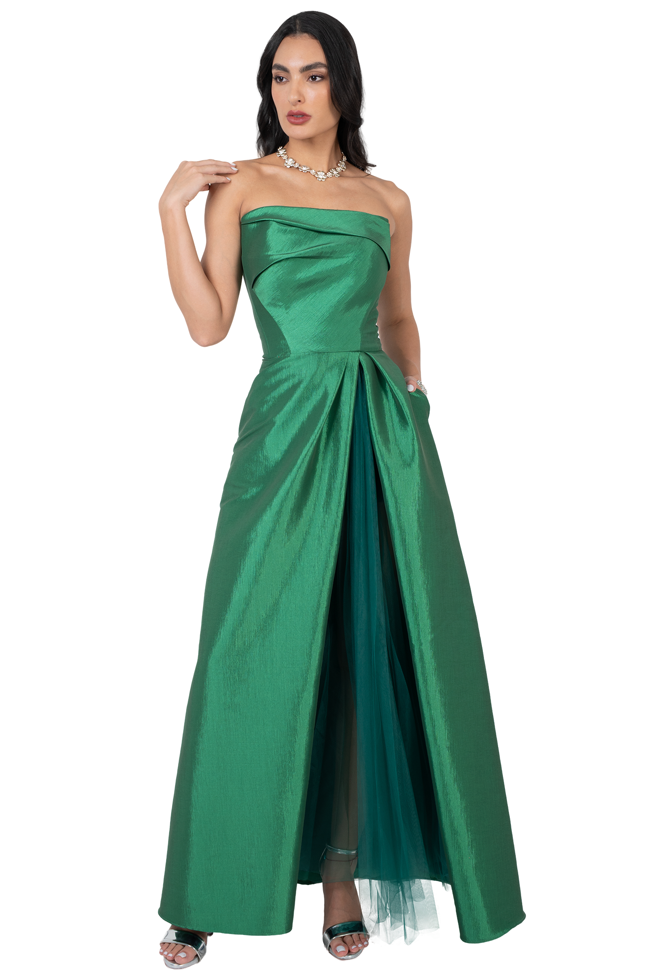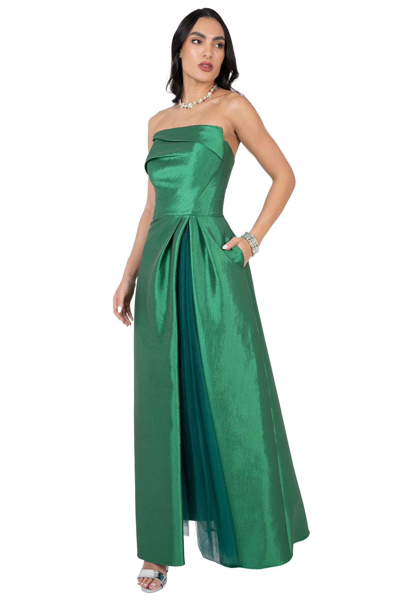 Vestido Largo de Gala Strapless con Tull Plisado