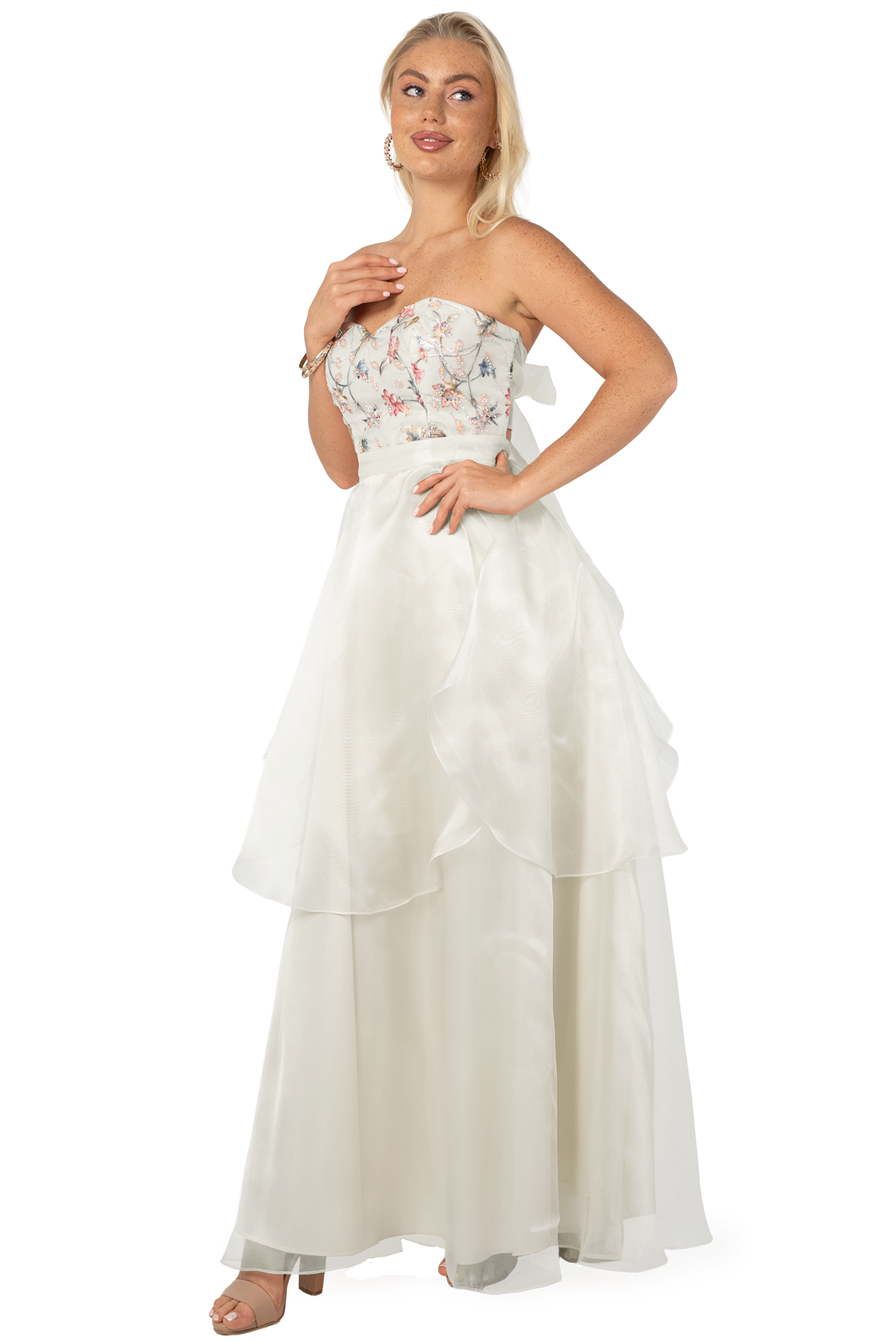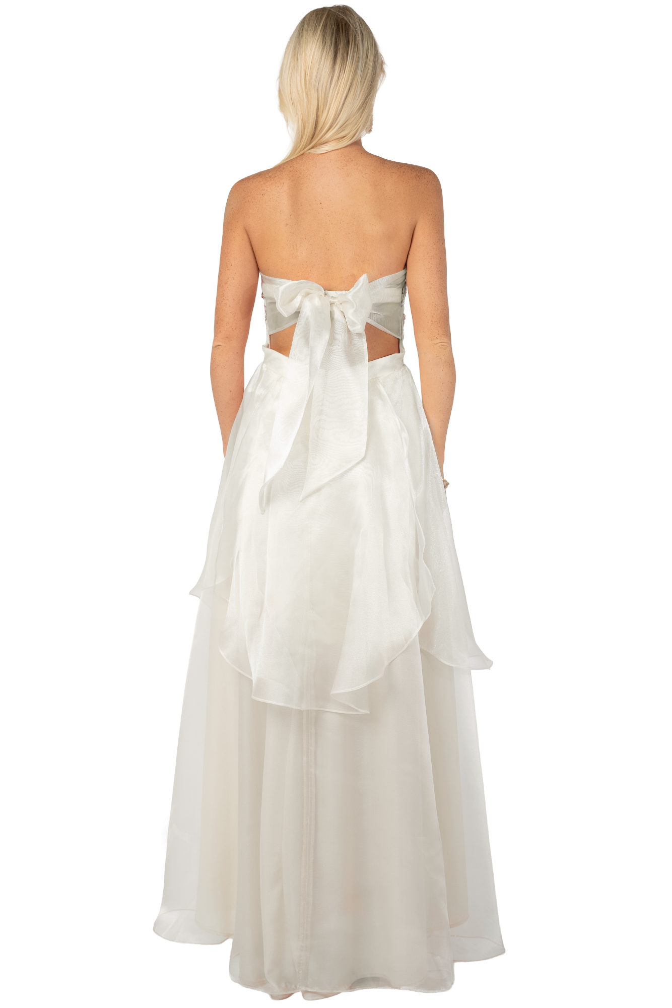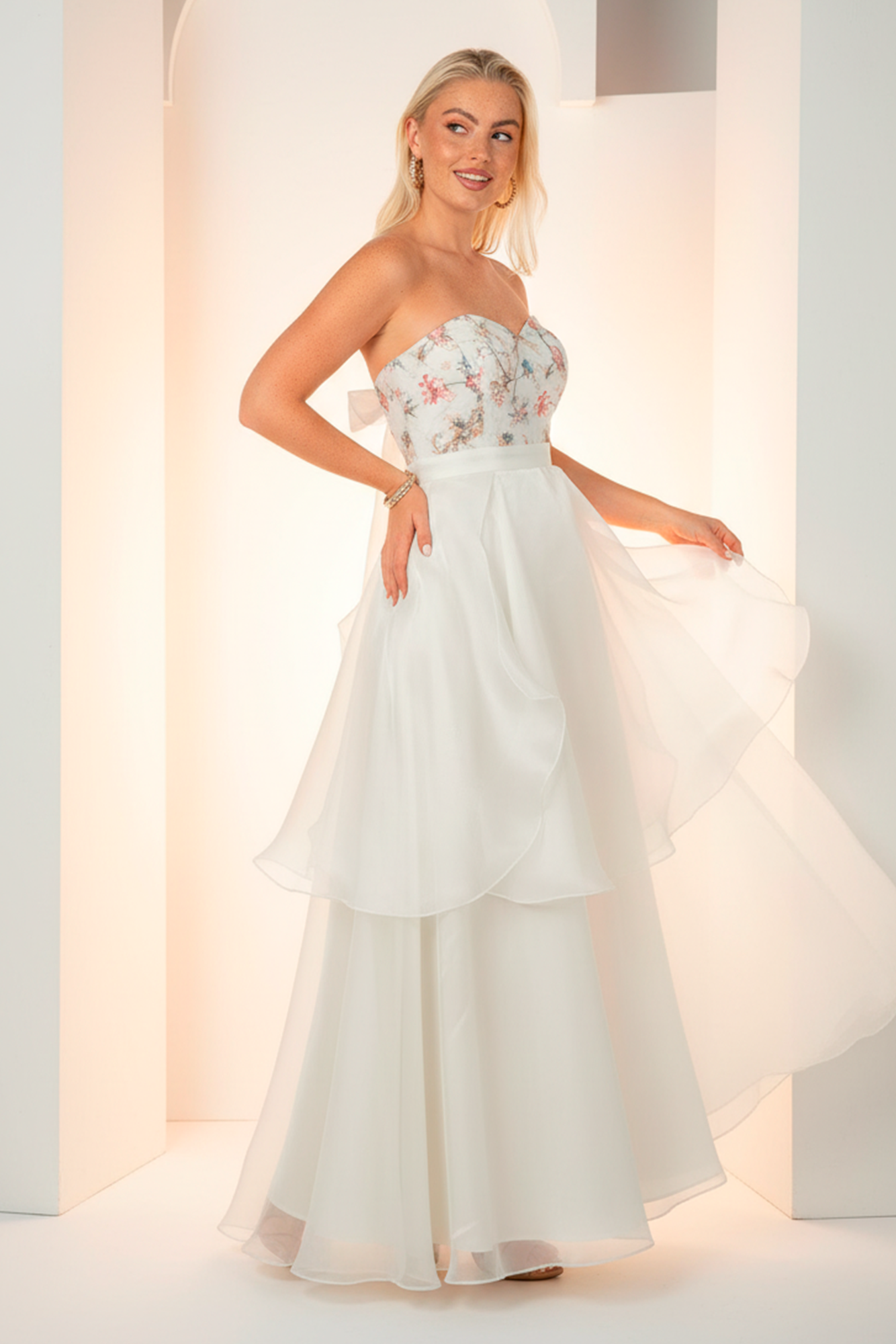 Celebra tu amor con un toque de encanto moderno en este hermoso vestido largo color hueso. Perfecto para tu boda civil o una graduación íntima, este modelo strapless fusiona la diversión de una falda amplia de capas de organza con el brillo sutil de un talle de lentejuelas.