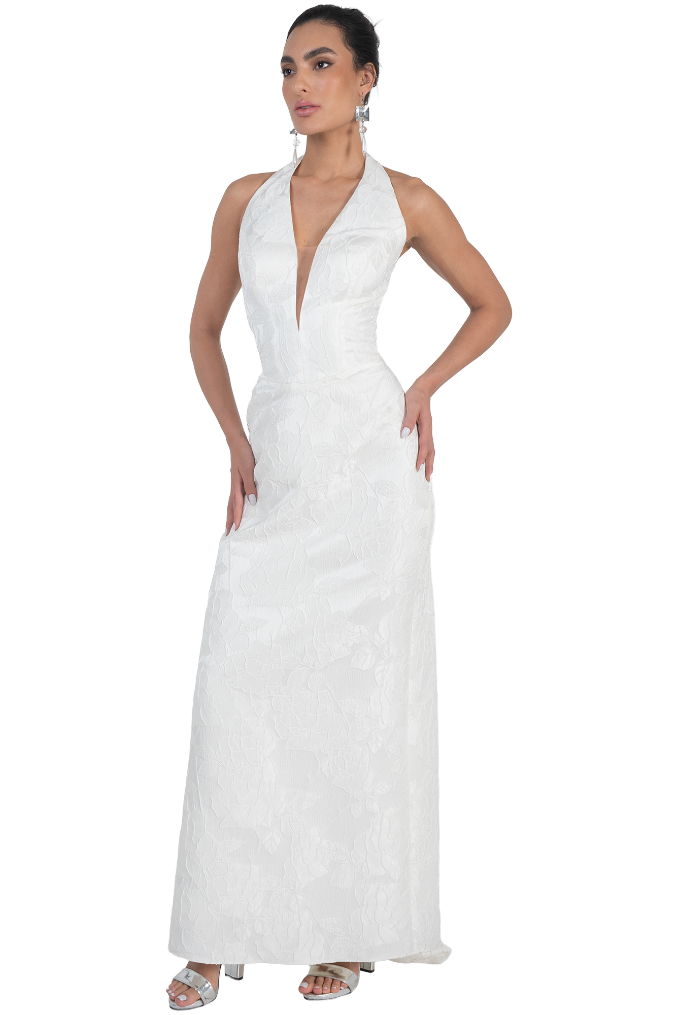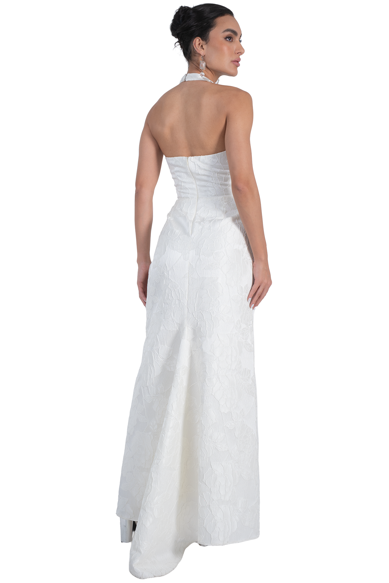 • Textura de Lujo y Diseño Vanguardista: Confeccionado en un majestuoso Jacquard, este vestido destaca por su relieve sofisticado y su capacidad para mantener una forma perfecta. El escote halter con transparencia alarga visualmente el torso y aporta un aire de sensualidad discreta y moderna, ideal para una boda de gala.