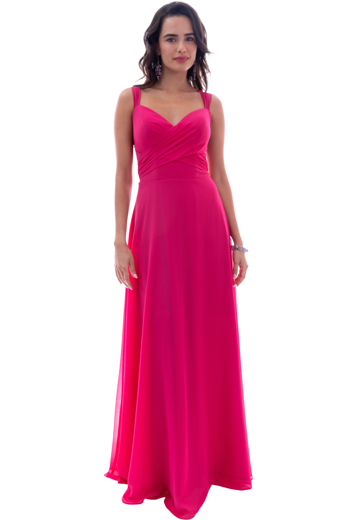 Vestido largo escote corazón, talle drapeado tipo imperio con falda semi A con pliegue al centro, espalda con jaretas para ajustar.